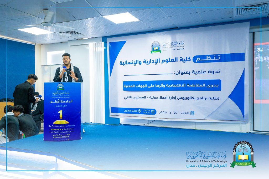عقدت في جامعة العلوم والتكنولوجيا – المركز الرئيس عدن ندوة بعنوان “جدوى المقاطعة الاقتصادية وأثرها على الجهات المعنية”، لطلاب البكالوريوس في تخصص إدارة أعمال دولية – المستوى الثاني.