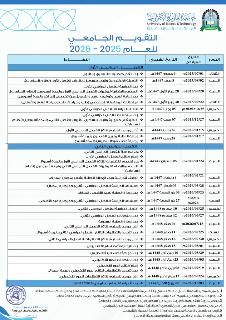 كلية الصيدلة التقويم الجامعي للعام 2025 - 2026م انقر هنا لتحميل التقويم الجامعي للعام 2022 -2023 جميع المواعيد المدونة تشمل النظام السنوي والفصلي ونظام الساعات بما فيه الدراسات العليا عدا المشار له بنظام الساعات فهو يخص نظام الساعات فقط.المواعيد المذكورة في التقويم أعلاه ليست نهائية وللجامعة الحق في تقديم أو تأخير المواعيد متى ما دعت الحاجة لذلك.يعطى مرونة للتقديم والتأخير بما لا يزيد عن أسبوعين لبرنامج بكالوريوس الطب العام والجراحة ويراعى ذلك في النظام. في حال حصول اختلاف في التاريخ الهجري (نظراً لرؤية الهلال) فيعتمد التاريخ الميلادي.الإجازات والعطل الرسمية بحسب إعلان وزارة الخدمة المدنية والتأمينات.ترتب الإجازة للكادر الأكاديمي وفقاً لنظام أعضاء هيئة التدريس.
