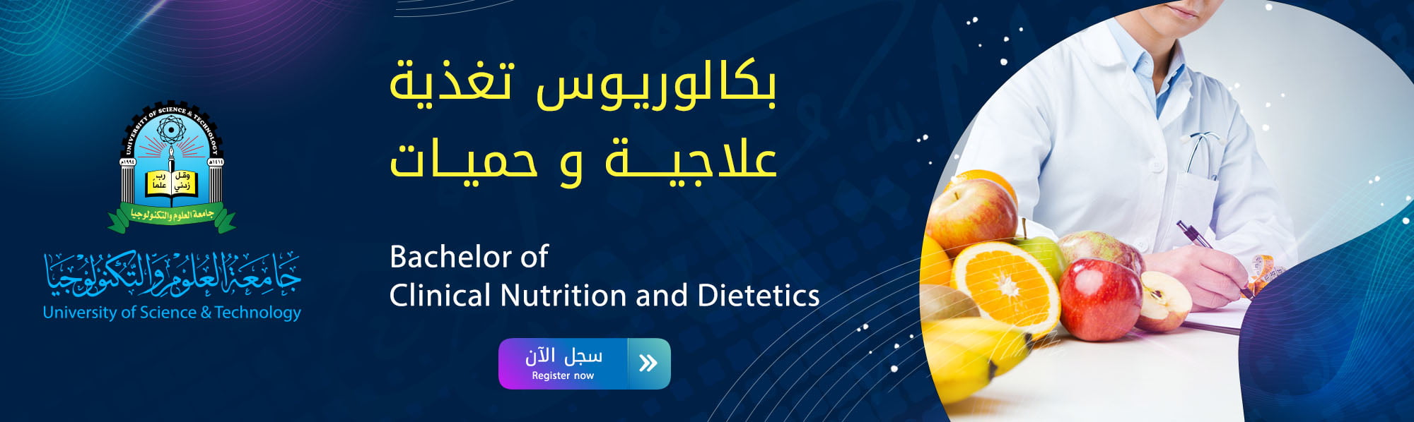 يُعد برنامج بكالوريوس التغذية العلاجية والحميات أحد البرامج الأساسية التي يقدمها قسم العلوم الصحية بكلية الطب والعلوم الصحية في جامعة العلوم والتكنولوجيا، ويمنح درجة البكالوريوس في علوم التغذية العلاجية والحميات. يهدف البرنامج إلى إعداد خريجين يمتلكون معرفة علمية وعملية متخصصة لفهم العلاقة الحيوية بين الغذاء وصحة الإنسان. يركّز البرنامج على استخدام التغذية كوسيلة علاجية فعّالة في الوقاية وإدارة الأمراض المزمنة المرتبطة بنمط الحياة مثل داء السكري، السمنة، وأمراض القلب والأوعية الدموية، حيث يكتسب الطلبة فهماً عميقاً لكيفية التداخل الغذائي مع هذه الحالات لتحسين جودة الحياة وتعزيز الصحة. كما يولي البرنامج اهتمامًا خاصًا بالجوانب المجتمعية والسلوكية المتعلقة بالصحة والتغذية، ويعزز وعي الطالب بأنماط التغذية السليمة ودورها في الوقاية والتدخل العلاجي. يشمل البرنامج مقررات علمية متقدمة وتدريبًا سريريًا وتأهيليًا في مؤسسات صحية معتمدة، بما يضمن تأهيل خريجين قادرين على العمل في مختلف قطاعات الرعاية الصحية والمجتمعية. ويشكل قاعدة أكاديمية للالتحاق بالدراسات العليا في مجال علوم التغذية.