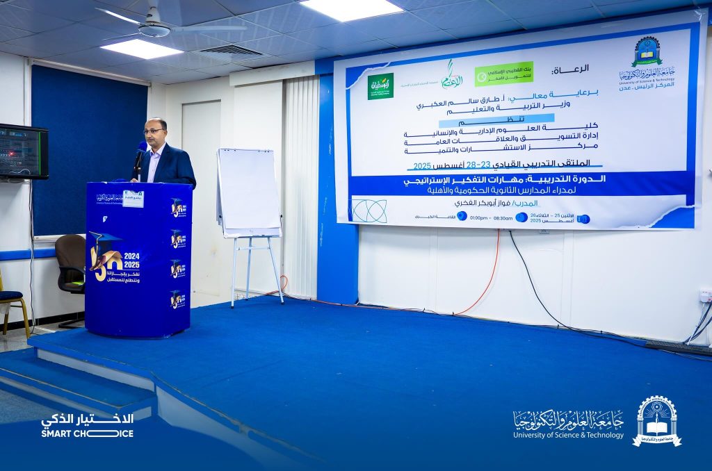 برعاية كريمة من معالي أ. طارق سالم العكبري وزير التربية والتعليم، انطلقت في جامعة العلوم والتكنولوجيا – المركز الرئيس عدن، صباح اليوم الاثنين الموافق 25 أغسطس 2025م، الدورة التدريبية: “مهارات التفكير الإستراتيجي” لمدراء المدارس الثانوية الحكومية والأهلية بالعاصمة عدن، والتي يقدمها المدرب فواز أبوبكر الفخري، على مدى يومَي الاثنين والثلاثاء، 25 و26 أغسطس 2025م، ضمن فعاليات الملتقى التدريبي القيادي الذي تنظمه الجامعة ممثلة بكلٍّ من: كلية العلوم الإدارية والإنسانية، وإدارة التسويق والعلاقات العامة، ومركز الاستشارات والتنمية.
