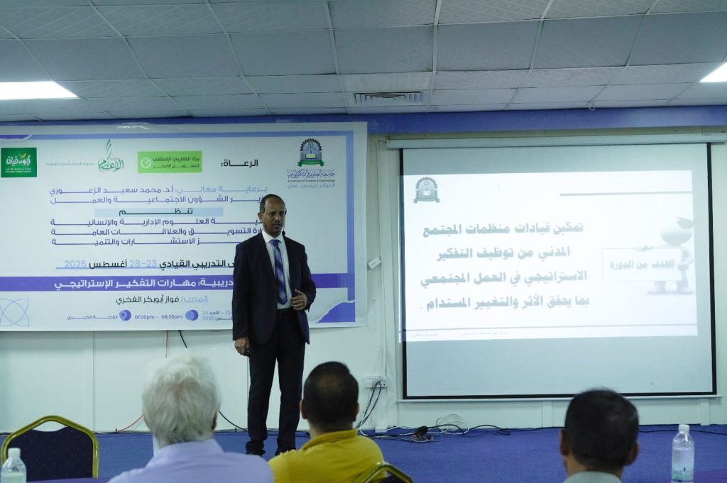 عقب ذلك، انطلقت أعمال الملتقى بدورة تدريبية برعاية معالي الدكتور محمد سعيد الزعوري وزير الشؤون الاجتماعية والعمل، بعنوان: “مهارات التفكير الإستراتيجي: نحو رؤية مؤثرة وتغيير مستدام”، قدّمها المدرب فواز أبوبكر الفخري، واستهدفت قيادات منظمات المجتمع المدني (نقابات، مؤسسات وجمعيات ومنتديات تنموية واجتماعية وخيرية).
