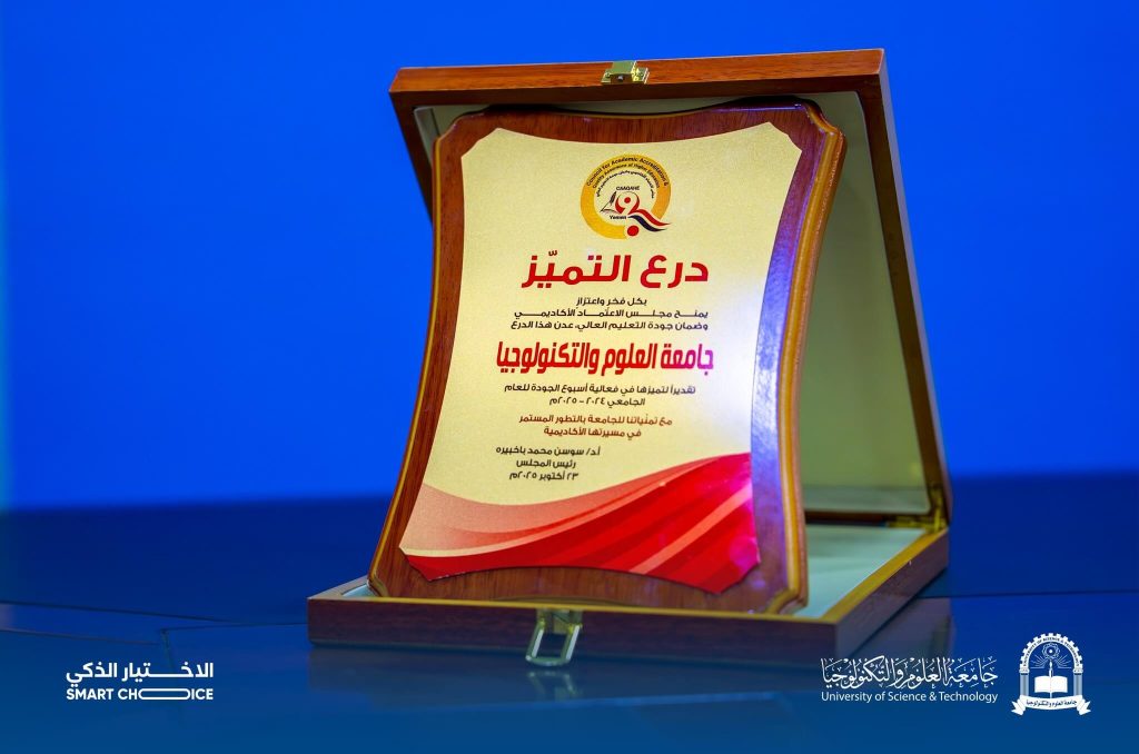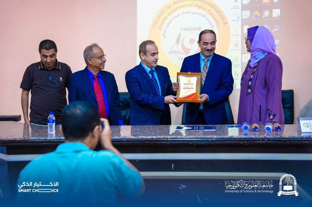 ويجسد هذا التكريم حرص جامعة العلوم والتكنولوجيا على ترسيخ مفاهيم الجودة الشاملة والتميز المؤسسي، وسعيها المستمر نحو تطوير الأداء الأكاديمي والإداري وفق المعايير الوطنية والدولية، بما يسهم في تحقيق رؤيتها ورسالتها نحو الريادة في التعليم والبحث العلمي وخدمة المجتمع.